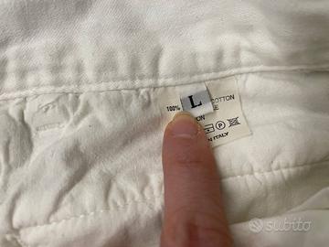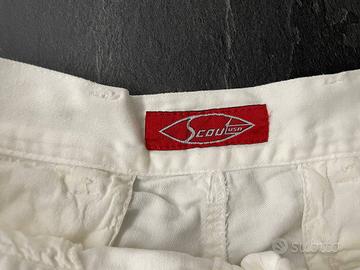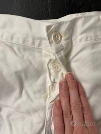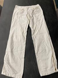 Pantaloni da donna 100% cotone spesso di colore bianco a vita bassa. La gamba è larga, in stile baggy, e ha toppe decorative sulle ginocchia. In fondo, si possono allargare per un effetto ancora più a zampa aprendo le cerniere dorate. Sono chiusi da bottone in vita e anche la patta è chiusa con due bottoni bianchi. Marchio: Scout Taglia: L Sono stati portati alcune volte, ma sono perfettamente integri. A causa dell'utilizzo e del tempo però presentano alcune macchie (tutto visibile in foto). Prezzo trattabile. Disponibili altre informazioni e foto su richiesta. * Articolo presente anche in altri siti*