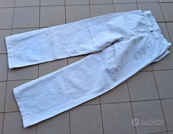N234) Raro paio di pantaloni bianchi per la uniforme estiva ex dotazione da Marinaio della Marina Militare, periodo anni '50. Stesso identico modello in dotazione alla Regia Marina dagli anni '20/30 agli anni '50 con la doppia patta anteriore, costruiti in modo molto particolare ed inconfondibile. Sono stati poco usati, si presentano in condizioni molto buone. Mancano un paio di comuni bottoni bianchi. Marchio matricolare presente. Taglia ovviamente non riportata, comunque sono taglie d'epoca quindi piccola. Queste sono le misure orientative e non impegnative, li cedo esclusivamente come oggetto da collezione: girovita cm. 75 - lunghezza totale cm. 111 - cavallo cm. 80 circa. Ottimo pezzo.