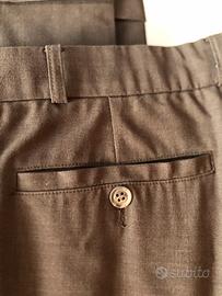 Colore marrone scuro (testa di moro), modello elegante con pinces frontali, tasche posteriori con bottone e risvolto al fondo.