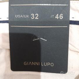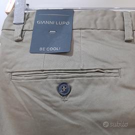 Pantaloni Chino Gianni Lupo taglia 46 Italiana (32 USA/UK). Colore verde militare, vestibilità Slim Fit, tasche a filetto anteriori, tasche con bottone posteriori, chiusura con zip e bottoni. 98% cotone, 2% Elastane.
