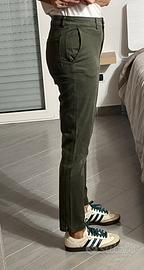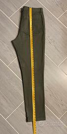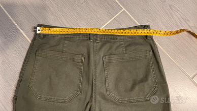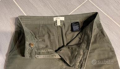 Pantaloni chino H&M, taglia Eur36, colore verde militare passanti per cintura, chiusura frontale con con cerniera bottone interno e bottone a vista.spacchettino alla caviglia. Tasche posteriori, leggermente elasticizzati per una vestibilità perfetta, usati un paio di volte praticamente nuovi un vero affare.