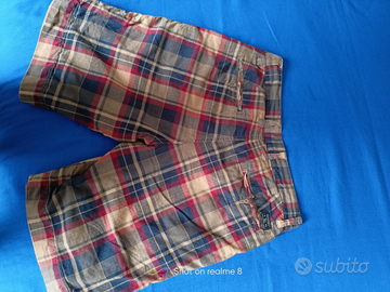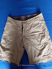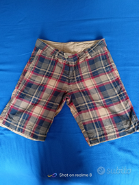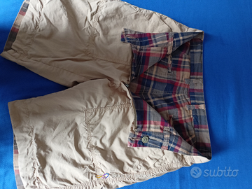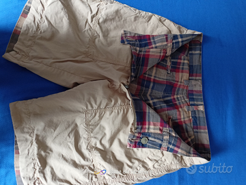 Pantaloni corti in cotone 100%. Double face: un lato tinta unita khaki, un lato a riquadri madras. Due pantaloni in uno! Due tasche laterali,due posteriori. Taglia del produttore S. Portati poche volte.