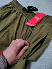 pantaloncino running verde militare con cerniere alle tasche più stampe cerniera anche sul retro .