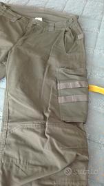 Pantaloni Decathlon da caccia verde militare in cotone resistente con tasche ai fianchi, rinforzi vari ed elastico in vita.