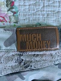 Graziosi pantaloni da donna a fantasia mimetica nei toni del verde, con inserti in pizzo. Non hanno etichetta, ma sono taglia 42, a vita bassa, in cotone, leggeri. Marca Much Money. Usati poco, in buono stato.