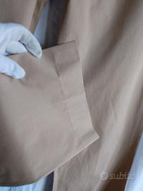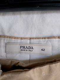 Bellissimo e classico pantaloni casual chic di Prada, taglia 42 italiana, colore beige, in cotone, gamba dritta, chiusura a zip, bottoni e gancio. Tasche laterali, taschino piccolo davanti in vita e una tasca dietro ancora chiusa. Made in Italy.