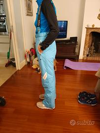 Pantaloni da sci Spyder azzurri taglia 44 (M), bretelle amovibili, vita regolabile, ghette elasticizzate, molto caldi ( non necessitano di strato sotto). In buono stato e lavati con prodotti specifici per isolare neve/pioggia.