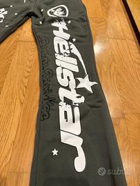 Pantaloni della tuta stile USA Drip Hellstar, modello flared, materiale tipo neoprene, bellissimo color verde scuro. Vestono una taglia L. NUOVI.