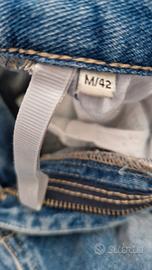 Jeans da donna in denim blu, modello casual con ricami floreali sui lati. Brand Naheva
