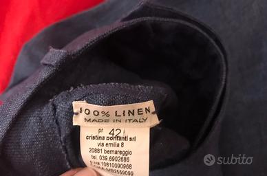 Pantaloni di lino da donna marca Cristina Bonfanti, taglia 42, color blu, vita alta con pence e gamba larga, chiedo 9 euro;