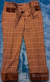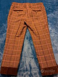 Pantaloni eleganti a quadri marrone e senape ,sopra alla caviglia, taglia bassa, chiusura con la cerniera e doppio bottone con l'inserzione D/G.