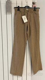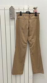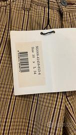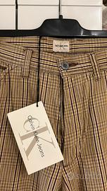 Questi pantaloni sono di colore beige chiaro con una stampa a motivo quadrettato che richiama un design classico e sofisticato. Il taglio è dritto e semplice, con una vestibilità che sembra comoda e adatta a un look casual ma elegante. La cintura è con bottone e passanti, e sono presenti due tasche anteriori. Sulla parte superiore è visibile l'etichetta del marchio Calvin Klein (misure in foto)