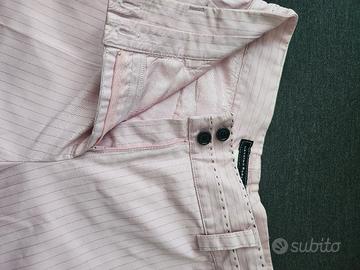 pantaloni donna eleganti a vita bassa, gamba dritta e larga, taglia 42, colore rosa tenue con leggere impunture nere in vita e sulle tasche. circonferenza vita cm.72 dal cavallo alla vita cm.25, indossati una sola volta per cerimonia.
