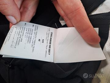 Pantaloni lunghi Off White c/o Virgil Abloh modello dritto in misto viscosa lana colore nero con dettagli stampati bianco. Modello semplice con tasche e passanti per cintura. fodera interno colore bianco. chiusura con bottoni, ganci metallici e cerniera. Taglia 40 IT - Made in Italy. Pantaloni usati raramente e in ottime condizioni, senza difetti.