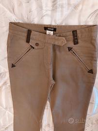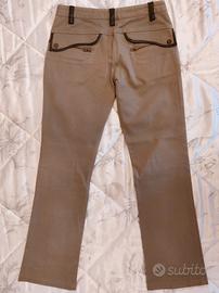 Pantalone da donna taglio jeans in cotone elasticizzato color nocciola con profili in ecopelle marrone, come da foto. Usati poco e tenuti benissimo.