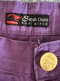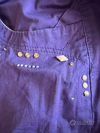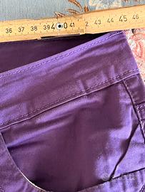 Cotone 98%, Lycra 2%; con decorazioni sui bordi delle tasche e dei taschini posteriori. Colore viola ( o lilla molto scuro). Ottima vestibilita’, misure in foto.