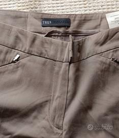 I pantaloni mostrati nell'immagine appartengono alla lineaTru Trussardi, come indicato dall'etichetta visibile nella parte interna della vita. Si tratta di un modello dipantaloni croppedocaprida donna, caratterizzato da un taglio dritto, tasche anteriori oblique con dettagli in metallo ( cerniere) e risvolti cuciti sul fondo della gamba.