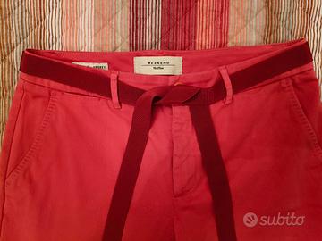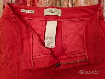 Pantaloni donna Weekend Max Mara originali. Modello Chino Audrey. Colore rosso, con piccola cintura (v. foto). Leggermente elasticizzati (2% elastan - 98% cotone). Taglia 42. Misure come da foto. Indossati un paio di volte. Ottimo stato. No resi.