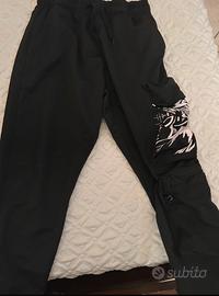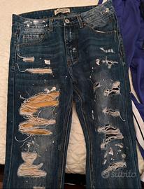 Pantaloni e jeans in ottimo stato 2jeans: Nero effetto strappato taglia 44 Blu effetto stappato taglia 44 1 pantalone elastico viola taglia M 2 pantalone neri : 1 pantalone nero classico taglia S 1 pantalone nero con scritte taglia M