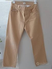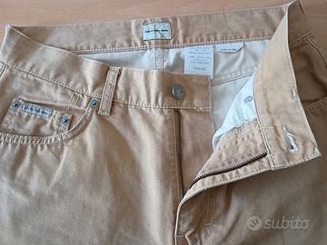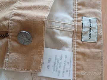 Pantaloni estivi 5 tasche Calvin Klein, 100% cotone con particolare lavorazione effetto righe tono su tono. Taglio dritto W 30, larghezza vita 37, lunghezza vita orlo 101, lunghezza cavallo orlo 73, larghezza mezza coscia 26. Due leggere scoloriture tasca e coscia posteriore, per il resto senza segni di usura.