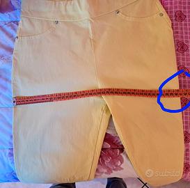 VENDO UN PAIO DI PANTALONI DA DONNA, T. S. DI COLORE GIALLO CHIARO, CARATTERIZZATI DA UNA VESTIBILITA’ ADERENTE ED UNA LUNGHEZZA ALLA CAVIGLIA. IN COTONE ELASTICIZZATO. PANTALONI SENZA CHIUSURE (ZIP O BOTTONI) PER UN MAGGIOR COMFORT, FINTE TASCHE FRONTALI E PICCOLI SPACCHETTI SUL FONDO GAMBA . MISURE COME DA FOTO. IN OTTIME CONDIZIONI.
