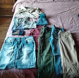 Vendo 4 paia di pantaloni come in foto, una gonna di jeans, due magliette, un cappello in lana, un maglione lungo ed un foulard. Vendo a 2 euro il cappello e foulard, 5 euro a pezzo i pantaloni, gonna e maglione. In blocco tutto 25 euro.