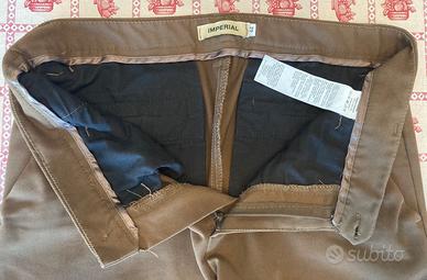 ✨ Dettagli del capo: Marca: Imperial (Made in Italy) Modello: Chino dal taglio dritto/slim, senza pences (piatto sul davanti). Colore: Marrone nocciola / Cammello (tonalità calda e facilmente abbinabile). Taglia: 44 Italiana. Materiale: Misto cotone elasticizzato (50% Cotone, 46% Poliammide/Poliestere, 4% Elastan, per garantire un'ottima tenuta della forma e massima comodità). Caratteristiche: Chiusura con zip e bottone logato, tasche laterali "alla francese", due tasche posteriori a filetto (senza bottone per un design più pulito), elegante risvolto cucito sul fondo. Condizioni: Eccellenti! Usati pochissimo, nessun segno di usura, difetto o sbiaditura del colore. 📏 Misure esatte (prese con il capo steso in piano): Vita (da lato a lato): 40 cm Lunghezza totale della gamba: 93 cm