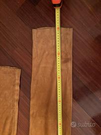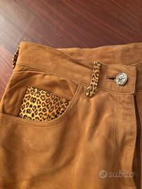 Pantaloni in camoscio color cognac con dettaglio alla tasca e passanti in tessuto leopardato. È presente unz piccola macchia sul fondo della gamba sx