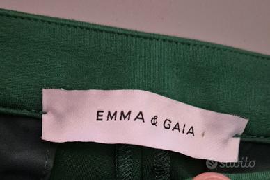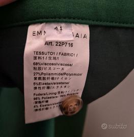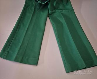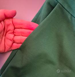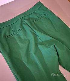 Portati una sola volta. Non hanno difetti. Pantaloni in jersey verde smeraldo scuro, modello a sigaretta leggermente svasato sul fondo. Piega centrale sulla gamba. Essendo in un tessuto jersey si adattano a più taglie, dalla 42 alla 44. Misure: cintura cm 42 - fianchi cm 50 - lunghezza cm 92