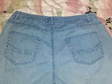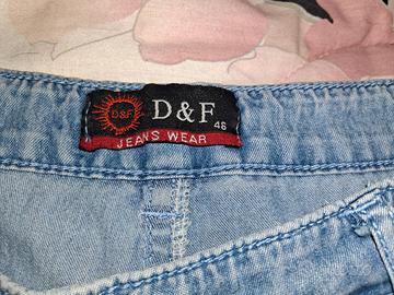 Pantaloni Jeans Donna in Cotone, Modello Capri / Pinocchietti, lunghezza al ginocchio. In Tessuto leggero e fresco: ideali per Primavera, Estate e Autunno. Pratici e comodissimi. Taglia Comoda Curvy elasticizzata: 46. La taglia indicata è una Taglia Comoda / Curvy, veste da una 46 a una 50 standard, inoltre sono elasticizzati. Tessuto elasticizzato in 95% Cotone, con aggiunta di 5% Elastan. Marca: D&F Jeans Wear. Vita medio-bassa con allacciatura in vita con bottone e cerniera. Con passanti in vita per cintura e 4 tasche, 2 laterali davanti e 2 dietro. Graziosi Ricami decorativi su tutte e 4 le tasche. Colore: Azzurro chiaro. Articolo perfetto, nessun difetto. Indossato solo un paio di volte. Lavato, stirato e sanificato.