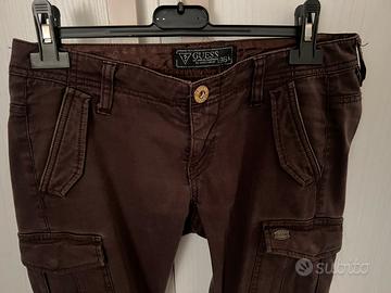 Pantaloni Jeans da donna dritti con taschoni laterali e cerniere in fondo. Due tasche davanti due dietro e due laterali sul davanti. Chiusura con cerniera e un bottone sul davanti. Colore marrone. Marchio Guess. Taglia 38/40. Molto belli.
