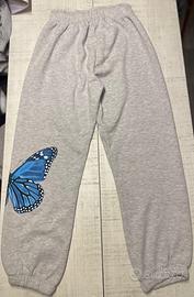 Jogger grigio chiaro con stampa laterale di farfallla azzurra. Vita e caviglie elasticizzate e lacci alla vita. Misure: lunghezza vita= 30cm circa, lunghezza totale= 80cm circa
