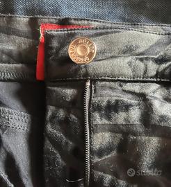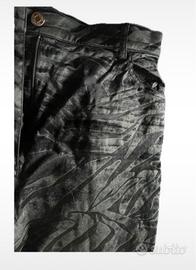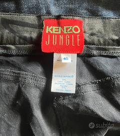 PREZZO TRATTABILE!! Raro e autentico paio di pantaloni Kenzo Jungle d'epoca, risalenti agli Anni '80/'90. Un capo iconico di Kenzo Takada con un design a vita alta super lusinghiero. Tessuto con una ricca trama che crea un sofisticato effetto zebrato o tigerato nero lucido su fondo nero opaco Vita altissima, taglio dritto/leggermente affusolato. ATTENZIONE: Il bottone in vita non è l'originale ed è stato sostituito con un bottone standard color argento ("PERFECTION"). Questo è l'unico difetto, e il prezzo tiene conto di questa modifica. Cerniera perfettamente funzionante. #kenzo #vintage #animalier #archive #luxury.
