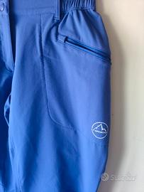 Leggeri pantaloni colore blu Tessuto leggermente elasticizzato -vita elasticizzata parte da 74cm fino a 84cm -fianchi 108cm -lunghezza 105cm