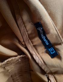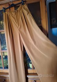 Pantaloni con passanti in vita e gamba larga. Pinces frontali. Chiusura davanti con cerniera invisibile e bottone con gancio. 2 tasche laterali , e 2 finte dietro.larghi al fondo , si portano con disinvoltura. in poliestere color tabacco.le misure ,in vita cm. 87, dalla vita al fondo cm 121taloni larghi da donna con pinces. Vita alta. Gamba larga. Tasche laterali.