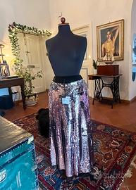 Pantaloni a palazzo Liu Jo, colore Meg Rose, completamente ricoperti di paillettes cangianti nei toni del rosa, oro e argento. Un capo davvero luminoso e chic, perfetto per feste, cerimonie o una serata speciale!