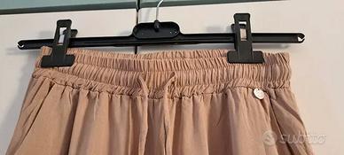 Pantaloni lunghi estivi e morbidi, con elastico in vita e caviglie e laccetti in vita, in poliestere, marca Lay, colore tortora, taglia S.