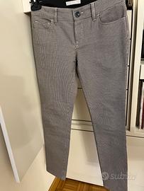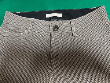 Vendo pantaloni marchio STEFANEL da donna originali, taglia 36, cotone elasticizzato, motivo piccolo pied-poule colore marrone chiaro con pied-poule marrone scuro e nero, modello a sigaretta, sul davanti due tasche rotonde è un taschino, sul dietro due tasche, con passanti per la cintura, impunture colore nocciola, cerniera nascosta e bottone in osso.