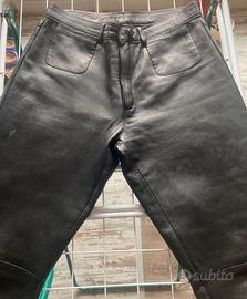 Pantaloni neri in vera pelle, da donna, usati poco, in condizioni molto buone. Da segnalare l'aggiunta di due toppe in pelle su un gambale, al di sotto al ginocchio, come da foto (intervento sartoriale). Interno foderato fino al ginocchio, fodero in perfette condizioni. Orli in fondo ai gambali in perfette condizioni. Piccolissimo graffio a lato della coscia destra (si vede in foto): veramente poco evidente, si nota solo in controluce. Altezza totale 98/99 cm circa. Larghezza della coscia all'altezza del "cavallo" 27/28 circa. Larghezza presa alla "vita" 36 circa. Larghezza presa all'altezza delle anche cm 50 circa. Larghezza del gambale in fondo cm 21,5.
