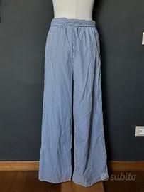 Pantaloni palazzo a righe sottili bianche e grigio scuro con dettaglio volant frontale e fiocco in vita, super femminili e particolari.