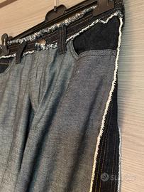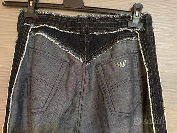 Vendo jeans Pantapalazzo originali emporio Armani, vita alta gamba larga pantalone lungo da usare con i tacchi, fasce laterali a contrasto color blu. Vendo in quanto per me sono una taglia troppo grande, usati giusto un paio di volte. Taglia eu 30. Segnalo sostituzione cerniera. Spedizione compresa nel prezzo.