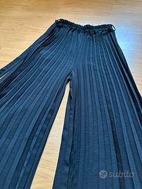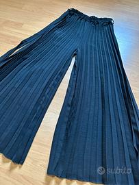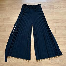 Pantaloni eleganti neri con una texture plissettata e design fluido. Presenta vita elasticizzata con laccetti per chiusura, gamba larga e svasata e materiale dal tessuto leggero e drappeggiato. Autentico Made in Italy e in perfette condizioni. SPECIFICHE Taglia: M Lunghezza (interno gambe): 61cm Lunghezza (esterno gambe): 90cm Materiale: Poliestere, Elastane