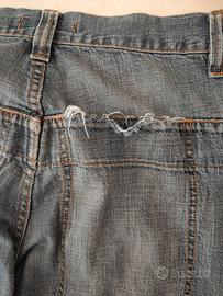 I pantaloni sono in buone condizioni generali, ma presentano segni di usura sulla tasca posteriore destra, sulla tasca anteriore destra e sono leggermente sciupati sul fondo della gamba destra, lato posteriore (tutti i difetti visibili in foto).