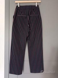 Pantalone vita alta taglia XS blu scuro a righe rosse e bianche, cerniera e chiusura a gancio, due bottoni decorativi in vita, tasche diagonali anteriori e tasche finte posteriori.