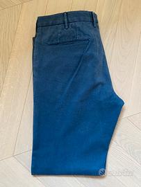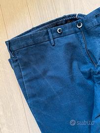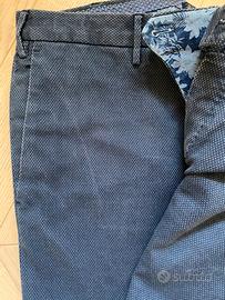 Splendidi pantaloni sartoriali GTA, vestibilità slim, fondo 18 cm,, colore blu, microfantasia, 8 passanti da 8 mm, zip insertata in metallo, cavallino in pulito, interno fantasia… bellissimi! Vero affare!!!