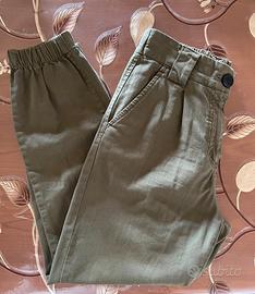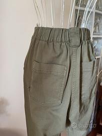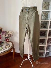 Pantaloni molto comodi e pratici; hanno elastico in vita solo dietro, due ampie tasche ai fianchi e due dietro; la targhetta della composizione non c’è più ma si tratta di un buon tessuto sostenuto e leggermente elastico, probabilmente cotone ed elastane. Nessun difetto. Misure: Vita centimetri 35, estensibili a 43 Fianchi centimetri 54 Lunghezza centimetri 92 Larghezza alla caviglia, centimetri 12,5