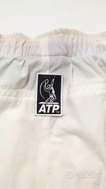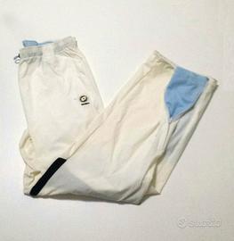 Pantaloni Originali Lotto ATP Da Tennis con allacciamento a cerniera lungo i lati sul fondo, completo di tasche per palline,colore bianco con strisce azzurre sulle cerniere una volta slacciati e bande nere sul lato posteriore Taglia XL. Condizioni:10/10 pari al nuovo