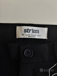 Pantaloni di Stradivarius neri, nuovi con cartellino, mai indossati, taglia EUR 38 (IT 42). Gamba ampia e dritta, vita media, con passanti per cintura. Tasche vere laterali e tasche finte a filetto sul retro. Dettaglio di pinces sul davanti. Chiusura frontale con cerniera e bottone.
