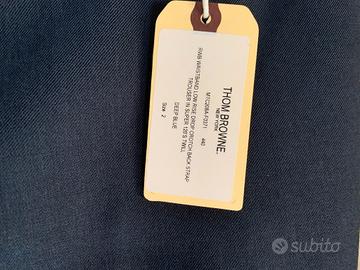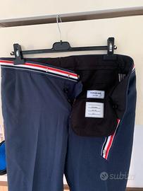 Pantaloni Thom Browne originali, colore blu scuro (Deep Blue), taglia IT 48. Modello sartoriale con vita bassa e cinturino regolabile sul retro, realizzati in pregiata lana Super 120’s twill.