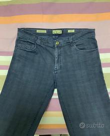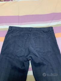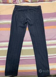 Pantalone tipo jeans, colore blu, con motivi a quadri/righe; tasche davanti e dietro. Taglia 48. Marca gruppo OVS . Cotone. Tutto come da foto.